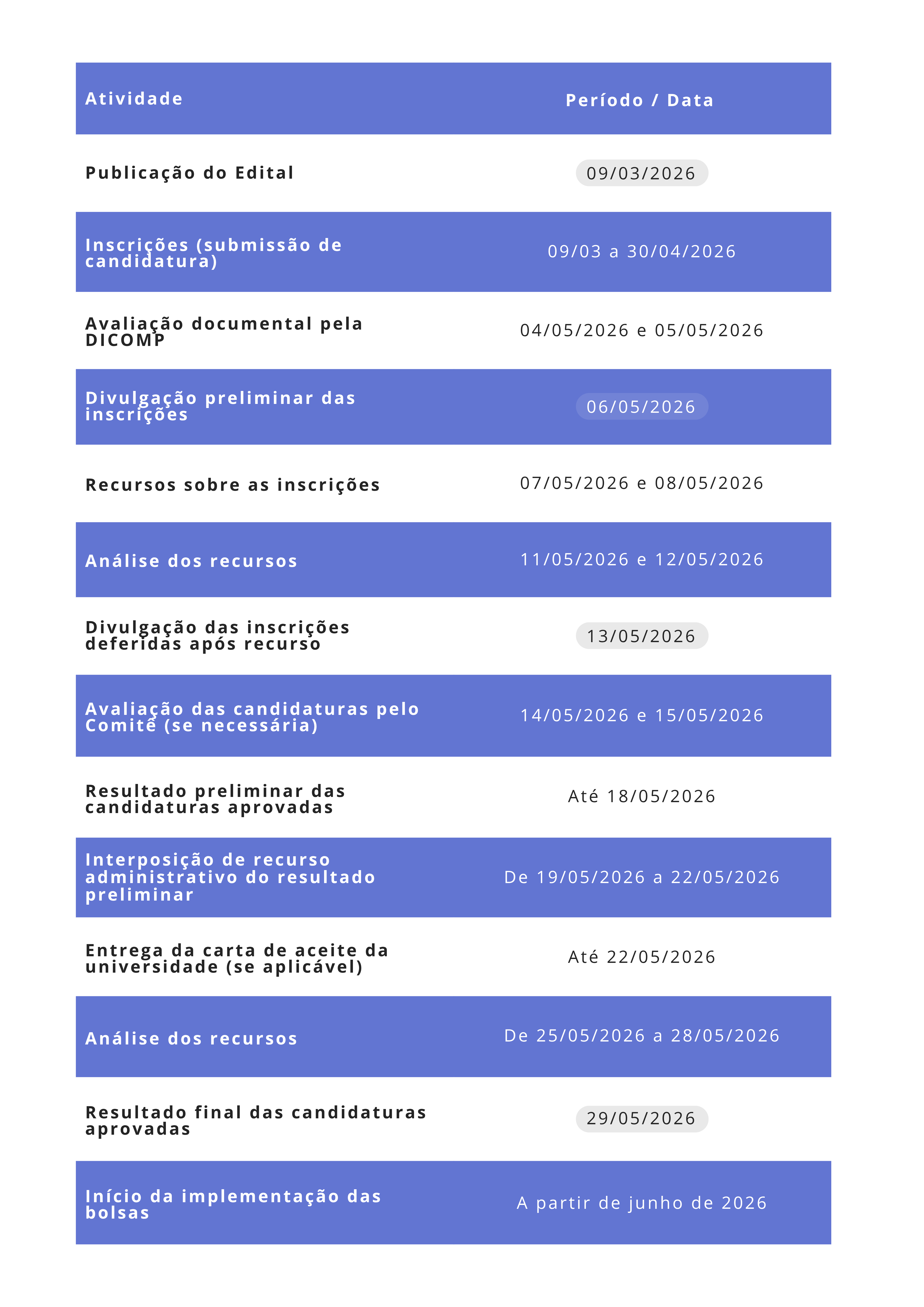 Todos os prazos encerram às 23h59, horário de Brasília.